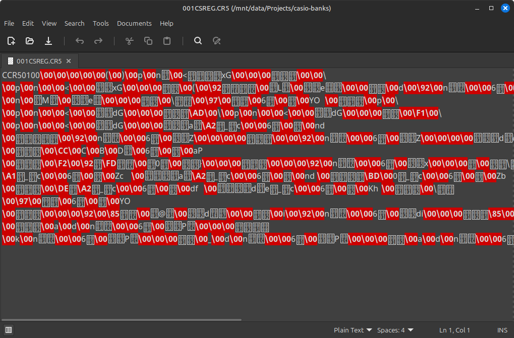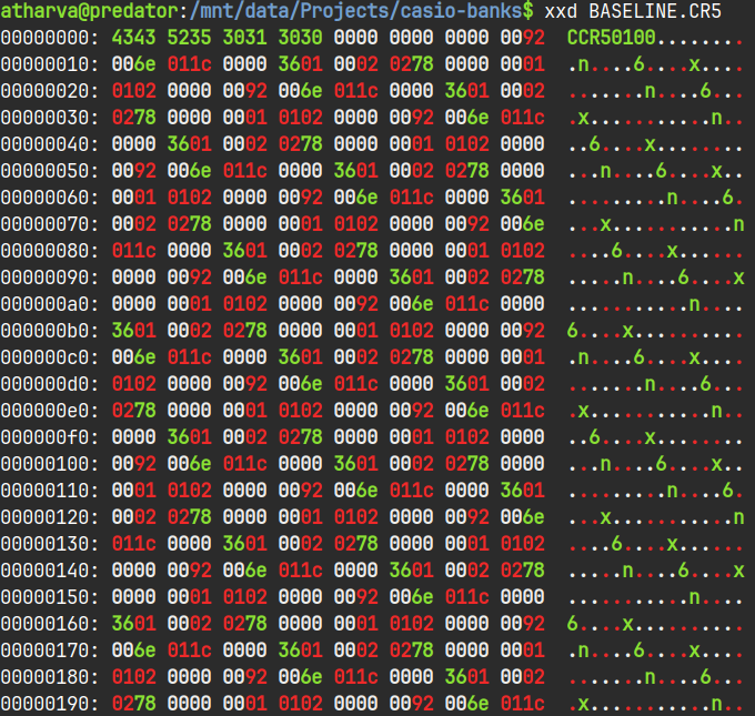 The hexdump didn't make it much more readable than before, however I could see some bytes at the very beginning which in ASCII spelled out CCR50100. This seemed to be the file signature for this format.(1) The keyboard most likely checks the signature before loading any data from the file.