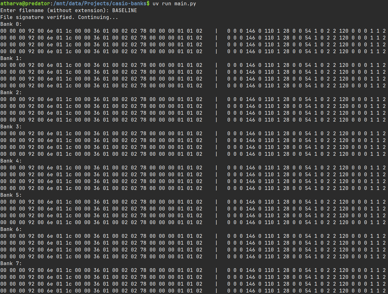 I decided that my goal was to first decipher this format and be able to print out all the stored data in a human-readable format, and then be able to edit the data and store it back into the file, which can be read by the keyboard.
