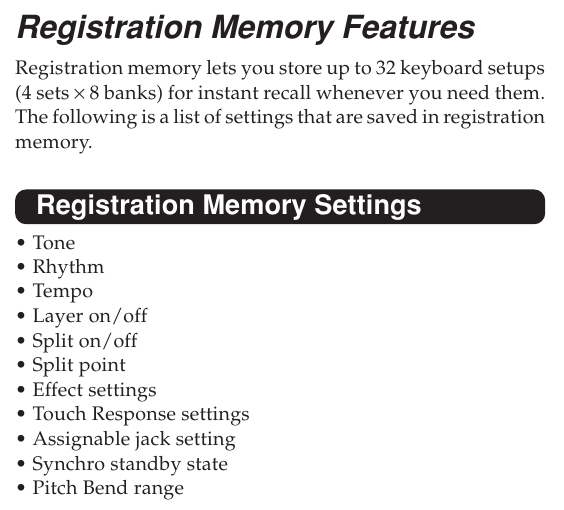 The CTK810-IN keyboard has a feature called 'Registration' which can be used to save & recall configurations at the press of a button. For example, if you're playing a song where you need to switch between three different instruments with different reverb settings, it's too difficult to change the settings while playing. The keyboard allows you to create preset configurations of settings like the tone, rhythm, tempo, pedal settings, etc. and save them to an internal registration memory, which you can recall at any time by pressing one of the four buttons. This makes it easy to switch between configurations while playing. The keyboard has 8 registration 'banks', each with 4 'setups', for a total of 32 different configurations.